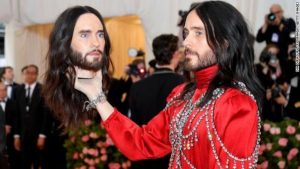 Wearing a red and crystal ensemble, Jared Leto arrived with an unusual guest: a replica of his own head.